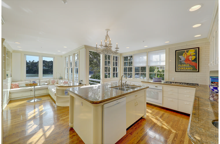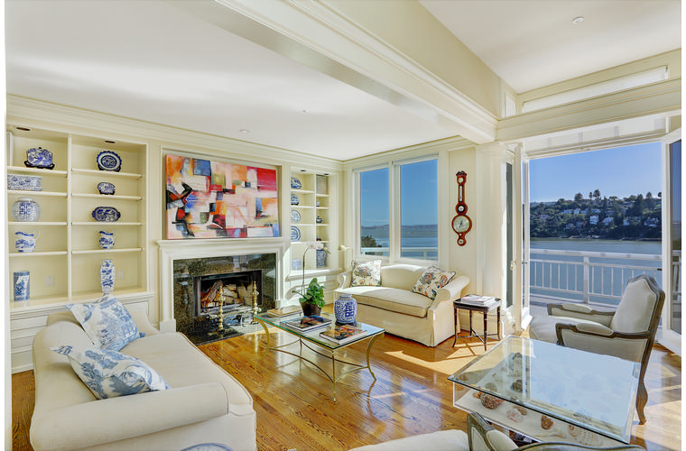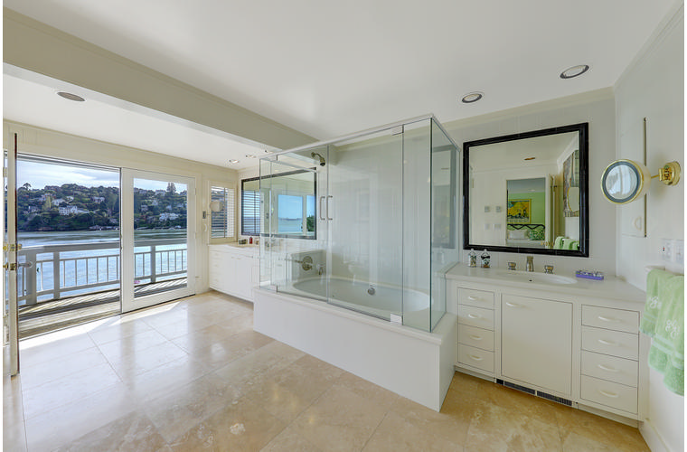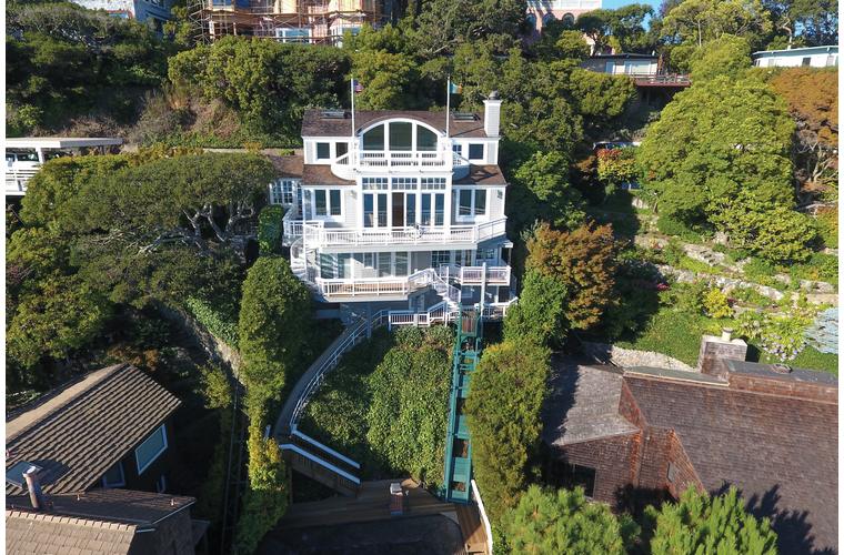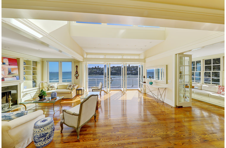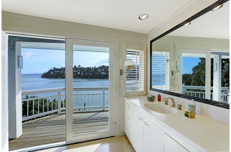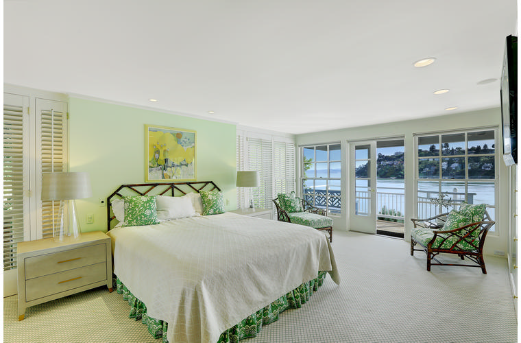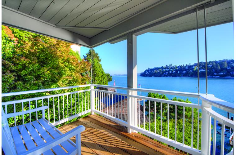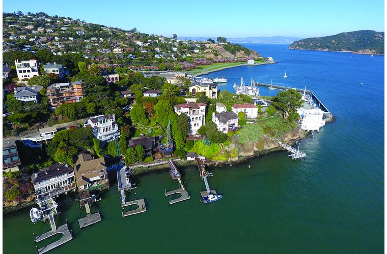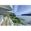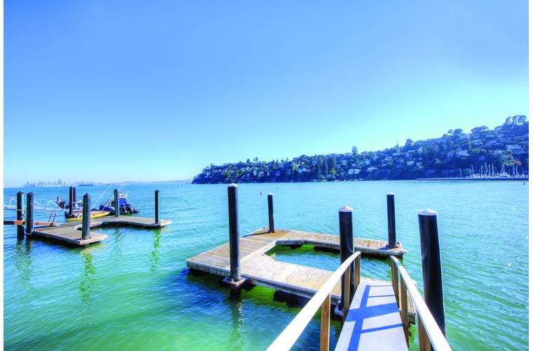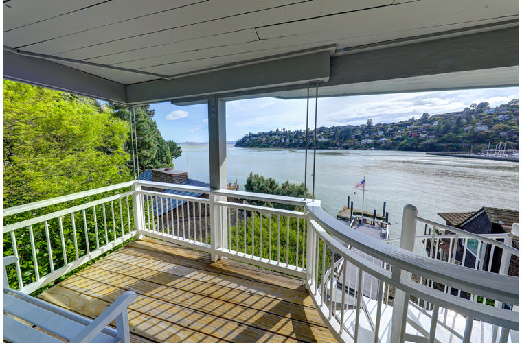 PRIME WATERFRONT HOME WITH 71 Bellevue Ave, Belvedere | $5,995,000 Immaculate Corinthian Island waterfront home at 3,325 square foot featuring 5 bedroom, 5.5 baths with fabulous boat dock, lift & a beach house, all with spectacular views of Belvedere Cove, San Francisco Yacht Club harbor, Bay and SF skyline. Sunny and protected location from wind and fog and short walk to two world-class yacht clubs & Downtown Tiburon. Entry Level Entering the pristine nautical blue lacquer front door complete with brass fixtures, this gracious home treats your eyes with the breathtaking views through the expansive windows framed by the distinctive high arched ceiling. Also on this floor is an office with built-in desk and an extra long twin bed and the library/5th bedroom with en suite bathroom featuring hand painted wall paper by artist Victoria Stratton. Both rooms have hardwood floors and open out to a view deck. Main Level Enjoy the panoramic views of Belvedere Cove, yacht harbor and San Francisco while entertaining in the spacious high ceiling living/dining room with a wall of doors leading out to a spacious deck. Hardwood floors and crown moulding throughout the room as well as a fireplace, built in shelves, and a powder room. Adjacent to the living/dining room is the sparkling eat-in kitchen surrounded by view windows, featuring marble counters and center island, two ovens, Sub-zero refrigerator, Bosch stove top, stainless steel sink, trash compactor, a desk, two built-in seating areas and access to a view deck. Behind the kitchen is a large walk-in pantry that spans the width of the home and provides an abundance of built-in shelving, storage cabinets, a second refrigerator, wine storage, and an utility sink. Lower Level The luxurious master suite with French doors leading out to a view deck. There are two closets with built ins, one walk in, window coverings and a mirrored walls that reflect the water views. The marble master bath has his and hers sinks, a deep jetted tub with overhead surround shower. The second bedroom, currently being used as a gym opens onto a view deck, has a mirrored closet with built ins, en-suite bath with a deep tub and overhead shower. The laundry room off the hallway has a Miele washer/dryer and additional storage. Guests Quarters Level The guests suite accessed through its own private entrance is complete with en suite bath with shower stall, tile counter/floors and shuttered windows. Beach House and Boat Dock Accessed by stairs and a hillavator, there is the beach house and boat dock. The beach house has a pitched high ceiling with exposed beams, hardwood floors, a kitchen, a fireplace, full bath and a murphy bed. The spacious deck leading to the private dock was recently upgraded with trex. There is a heavy duty boat lift and a floating dock with easy access to San Francisco Yacht Club harbor and the Bay.