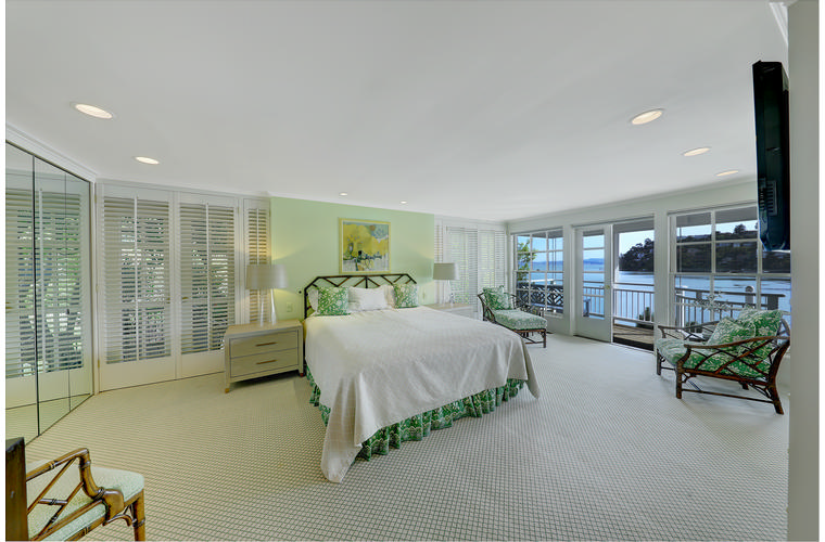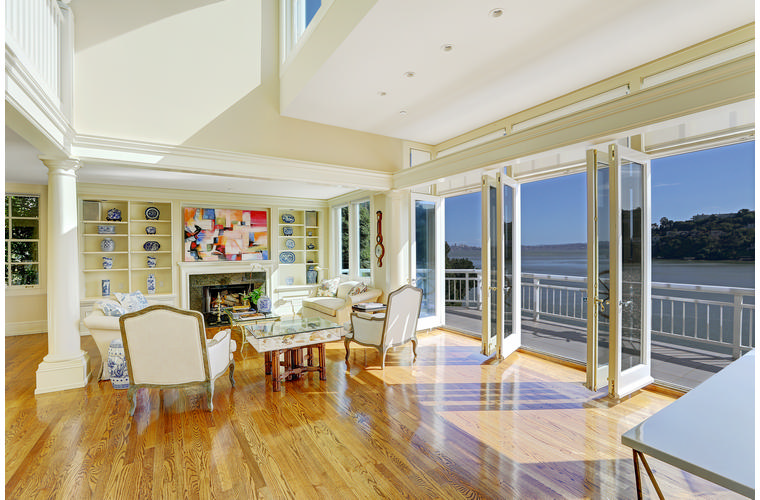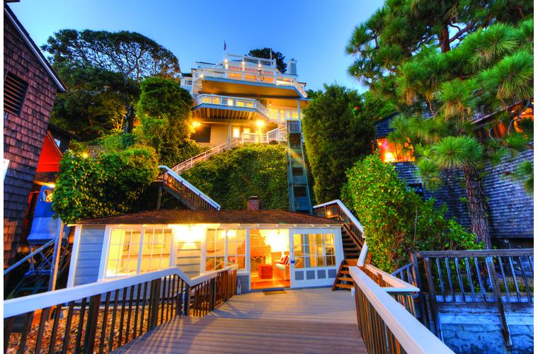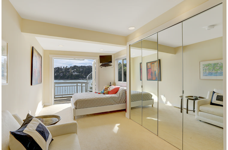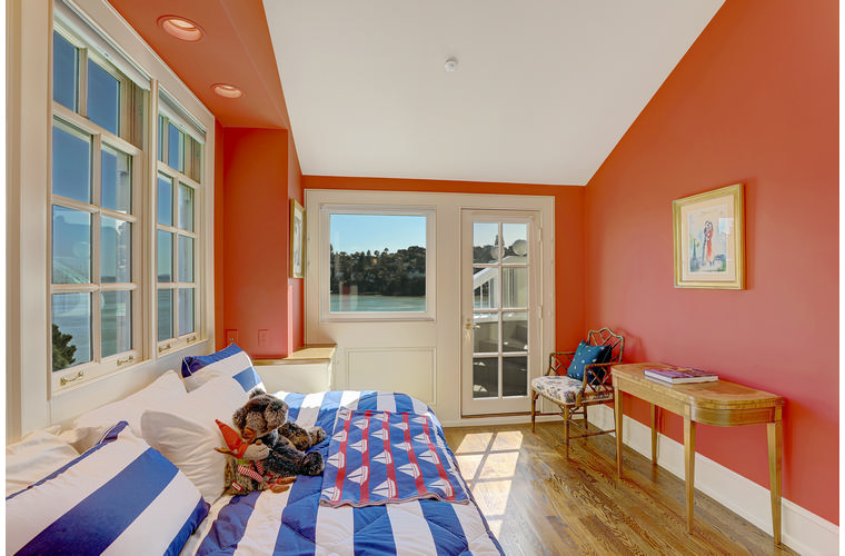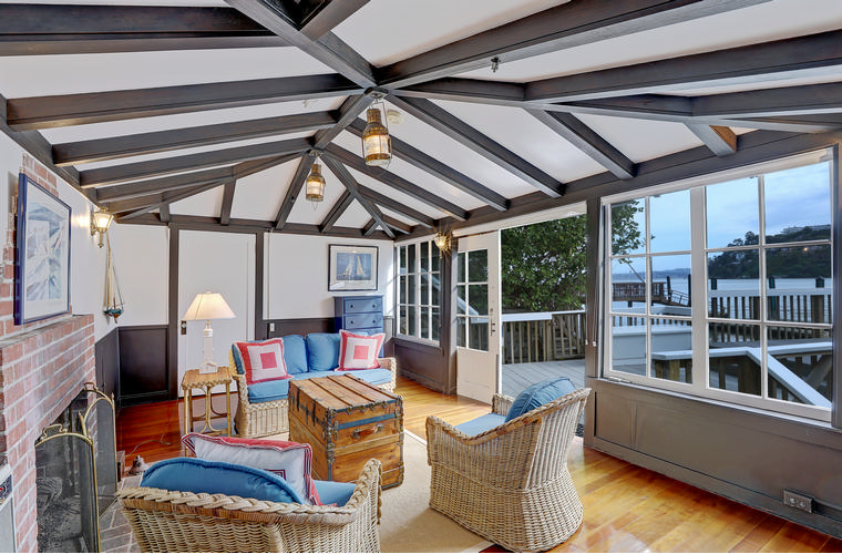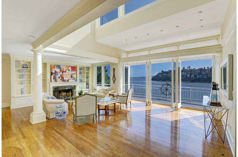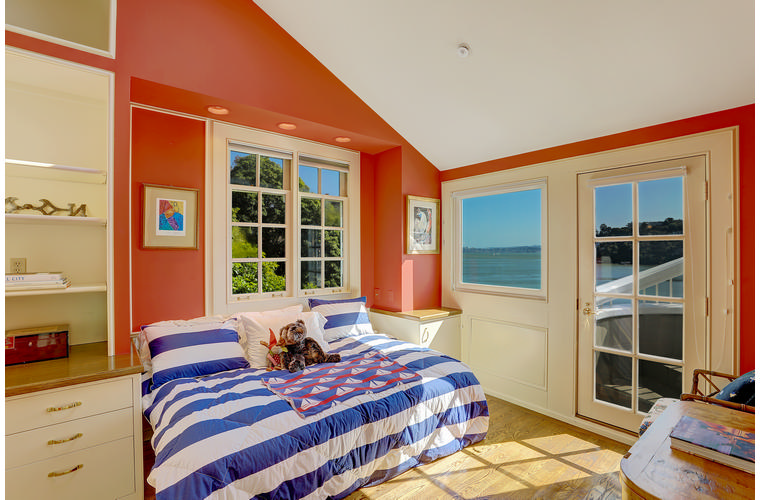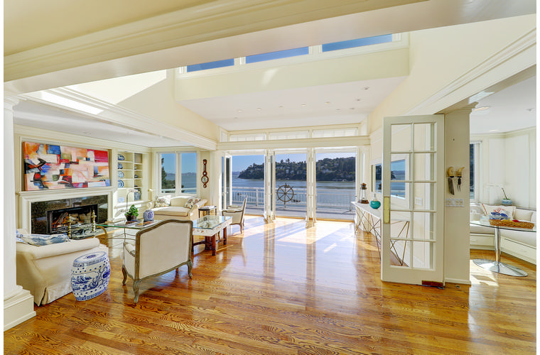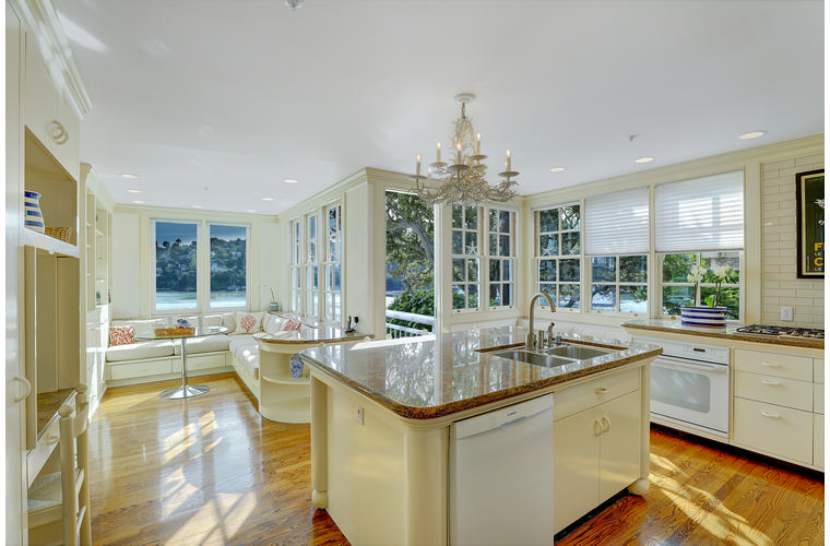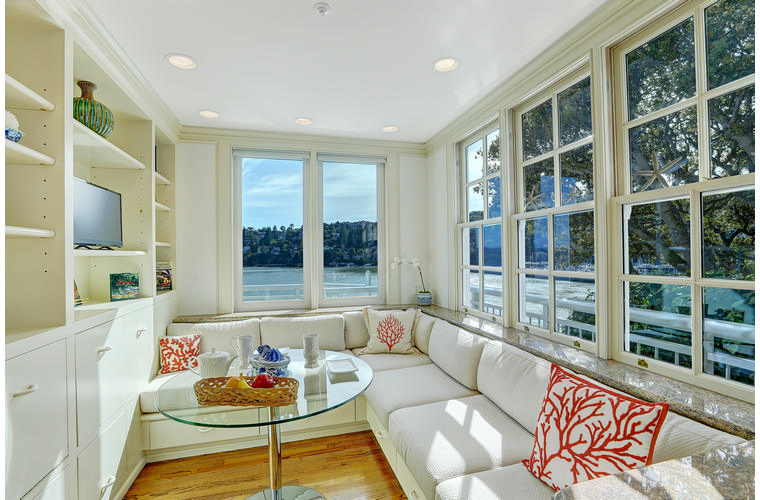 PRIME WATERFRONT HOME WITH 71 Bellevue Ave, Belvedere | $5,995,000 Immaculate Corinthian Island waterfront home at 3,325 square foot featuring 5 bedroom, 5.5 baths with fabulous boat dock, lift & a beach house, all with spectacular views of Belvedere Cove, San Francisco Yacht Club harbor, Bay and SF skyline. Sunny and protected location from wind and fog and short walk to two world-class yacht clubs & Downtown Tiburon. Entry Level Entering the pristine nautical blue lacquer front door complete with brass fixtures, this gracious home treats your eyes with the breathtaking views through the expansive windows framed by the distinctive high arched ceiling. Also on this floor is an office with built-in desk and an extra long twin bed and the library/5th bedroom with en suite bathroom featuring hand painted wall paper by artist Victoria Stratton. Both rooms have hardwood floors and open out to a view deck. Main Level Enjoy the panoramic views of Belvedere Cove, yacht harbor and San Francisco while entertaining in the spacious high ceiling living/dining room with a wall of doors leading out to a spacious deck. Hardwood floors and crown moulding throughout the room as well as a fireplace, built in shelves, and a powder room. Adjacent to the living/dining room is the sparkling eat-in kitchen surrounded by view windows, featuring marble counters and center island, two ovens, Sub-zero refrigerator, Bosch stove top, stainless steel sink, trash compactor, a desk, two built-in seating areas and access to a view deck. Behind the kitchen is a large walk-in pantry that spans the width of the home and provides an abundance of built-in shelving, storage cabinets, a second refrigerator, wine storage, and an utility sink. Lower Level The luxurious master suite with French doors leading out to a view deck. There are two closets with built ins, one walk in, window coverings and a mirrored walls that reflect the water views. The marble master bath has his and hers sinks, a deep jetted tub with overhead surround shower. The second bedroom, currently being used as a gym opens onto a view deck, has a mirrored closet with built ins, en-suite bath with a deep tub and overhead shower. The laundry room off the hallway has a Miele washer/dryer and additional storage. Guests Quarters Level The guests suite accessed through its own private entrance is complete with en suite bath with shower stall, tile counter/floors and shuttered windows. Beach House and Boat Dock Accessed by stairs and a hillavator, there is the beach house and boat dock. The beach house has a pitched high ceiling with exposed beams, hardwood floors, a kitchen, a fireplace, full bath and a murphy bed. The spacious deck leading to the private dock was recently upgraded with trex. There is a heavy duty boat lift and a floating dock with easy access to San Francisco Yacht Club harbor and the Bay.